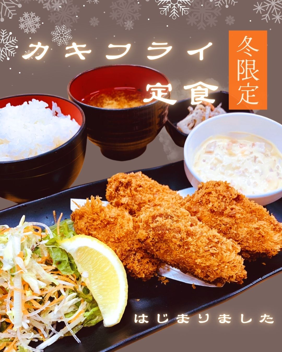 カキフライ定食期間限定の大人気冬の定食。ひと粒ごとに広がる濃厚な旨みと、サクッと軽い衣の食感が食欲を誘います。どうぞこの機会ご賞味ください。