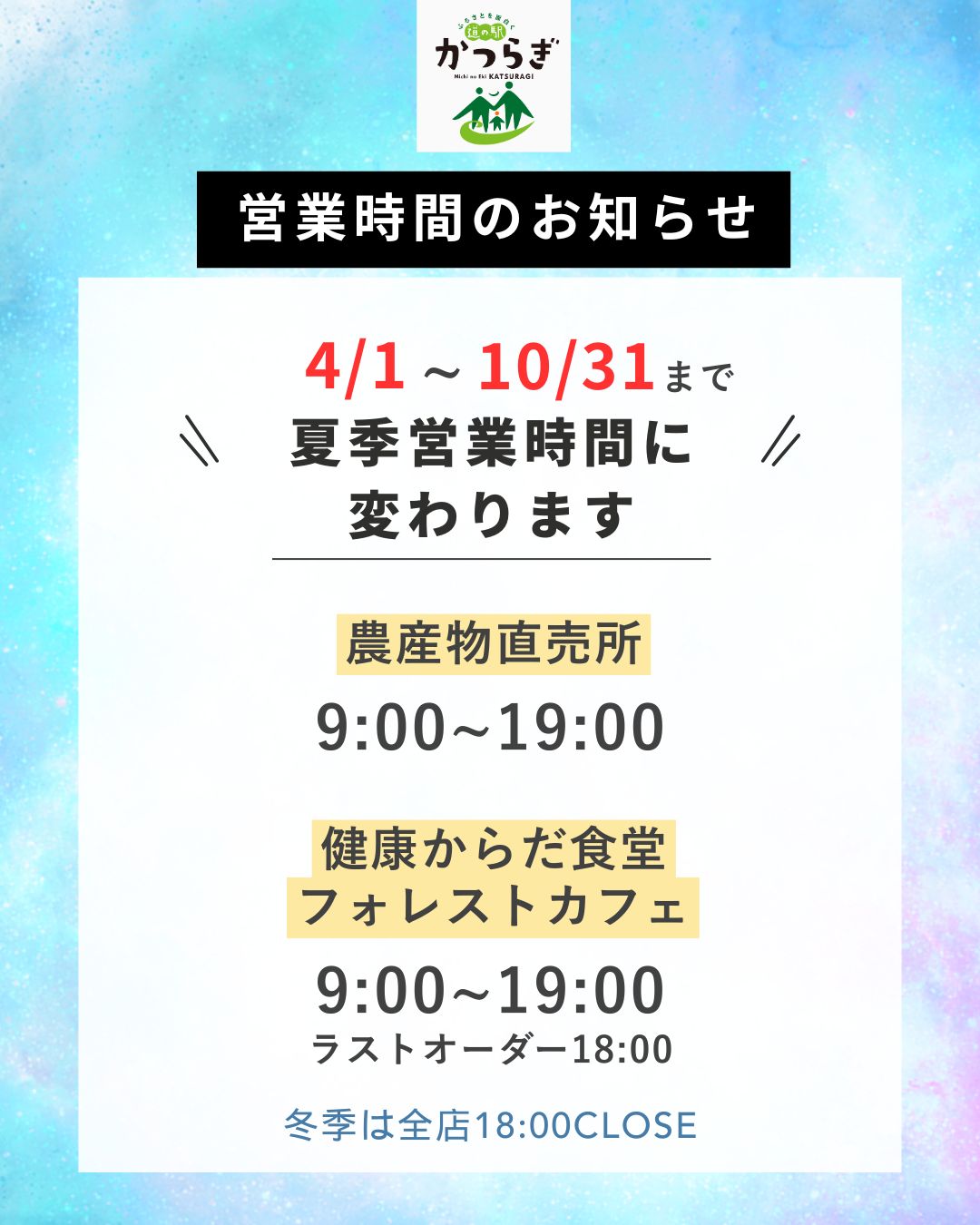 4/1~10/31まで夏季営業時間での営業とさせていただきます。